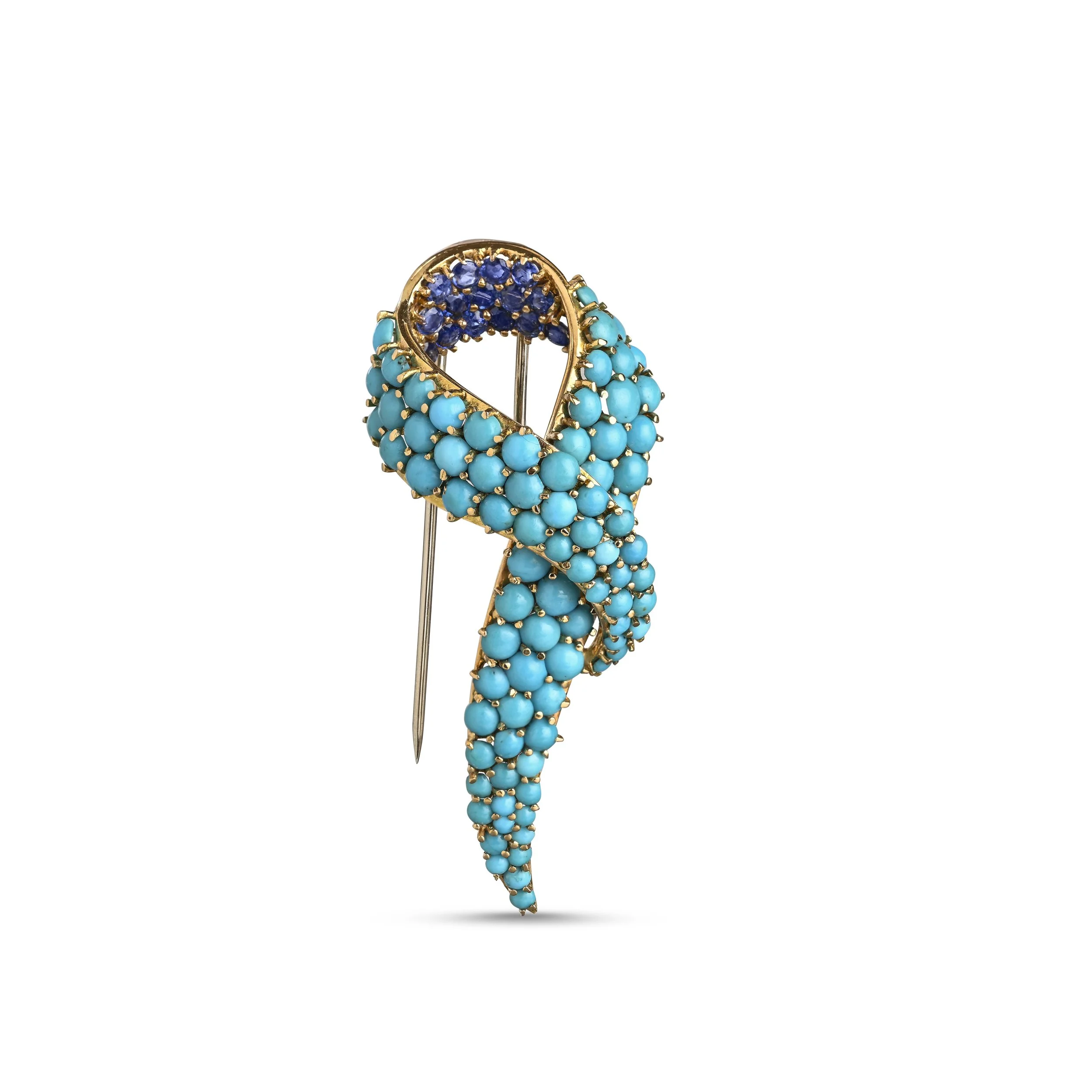 A Stylised Turquoise and Sapphire Ribbon Brooch