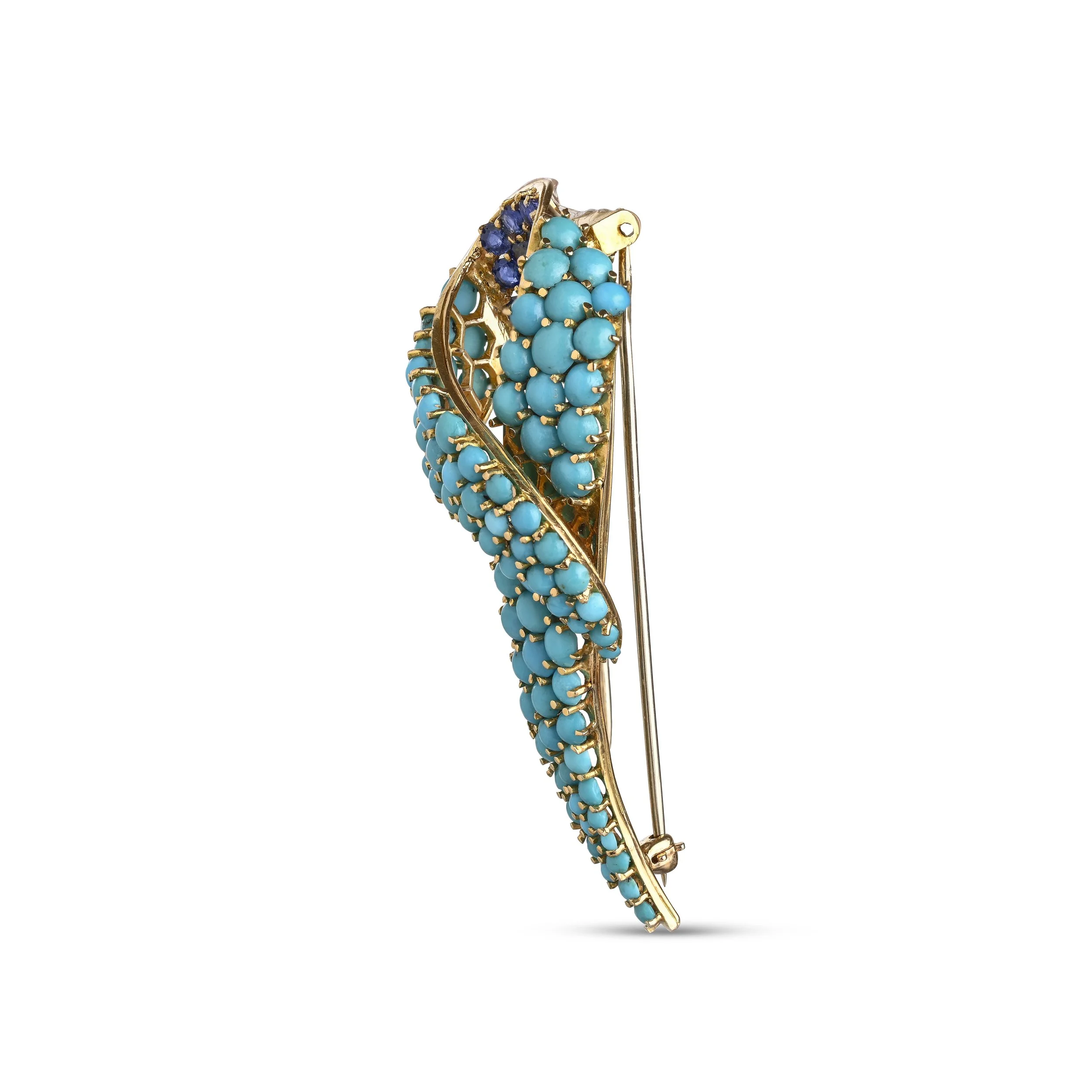 A stylised ribbon brooch, having three rows of graduating turquoises, set on the reverse of the ribbon with three rows of sapphires.